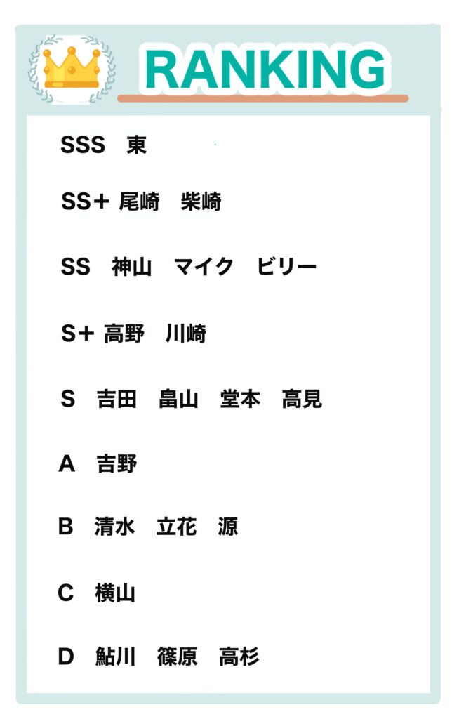 SS+にしなかった理由として、才能は東と同じくらいなのだが、卑怯な手を使ったり、有利な環境でも勝てなかったことを考慮してである。