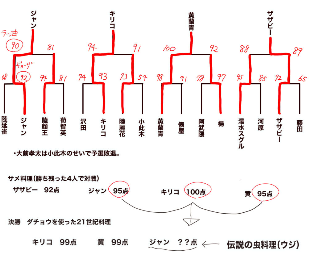 料理のレベルは高く、第一回大会3位、第二回大会も2回戦まで進んだ(2回戦も92点と高得点だったが黄に満点を出され敗北)。キリコ、ジャン、黄には少し劣るためS+とした。