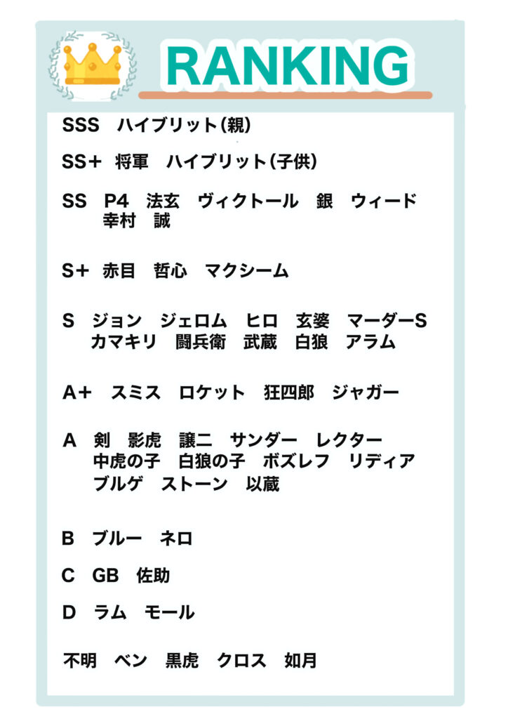 そんなあなたの為に、強さがひと目でわかる表と、そのキャラクターを解説したので、是非みてほしい。