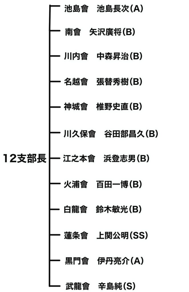双頭龍の頭で同じ地域のE .M .O.Dより人数は多いが敗北し、前川に謝罪するが裏切り卍の池島會の傘下となり叛旗を翻している曲者。